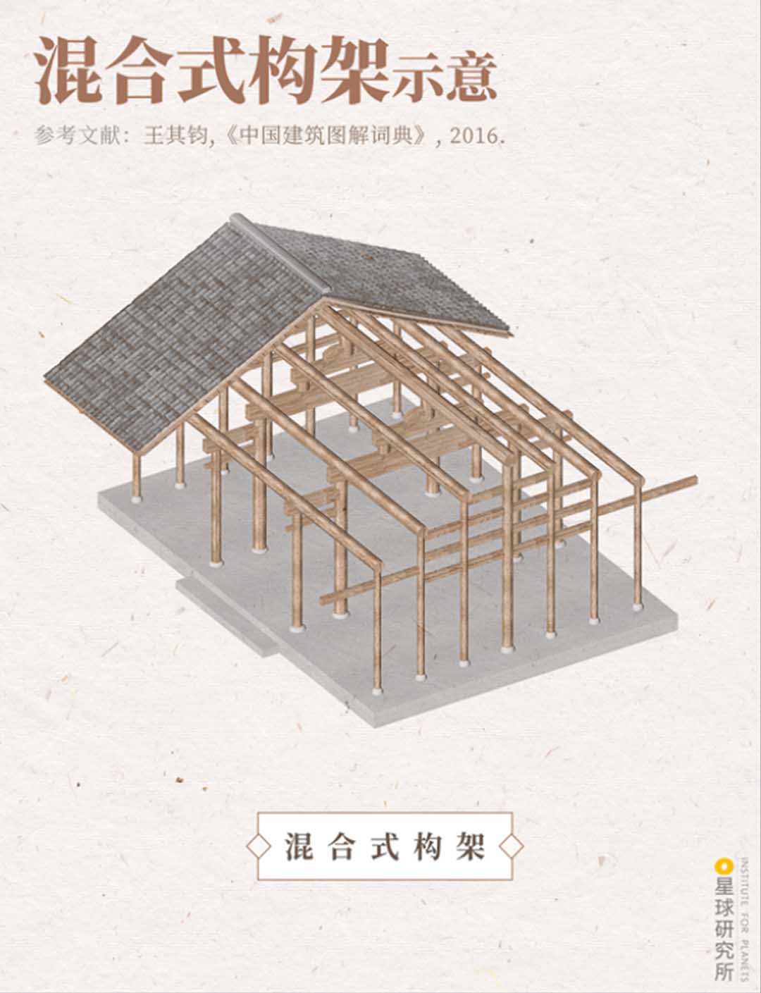 人們吸取兩方的優(yōu)勢(shì),在廳堂等重要空間,以抬梁式構(gòu)架為支撐,在兩側(cè)山墻、臥室等次要空間,替換為穿斗式構(gòu)架,一種新型的建筑結(jié)構(gòu):“混合式構(gòu)架”就此誕生!