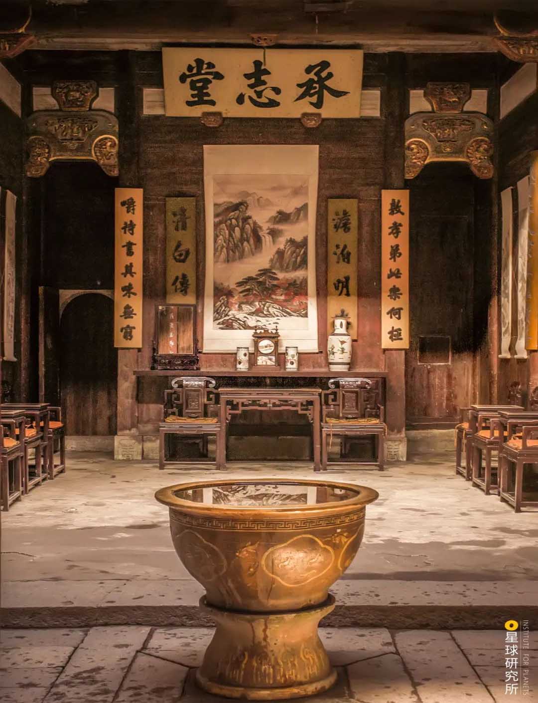 (宏村承志堂,徽州的廳堂一般題有堂名,掛有代表家訓(xùn)的對(duì)聯(lián),正中供桌上的銅鏡用來正衣冠,鐘用來計(jì)時(shí),瓶往往用來放主人的帽子,有帽子表示主人在家,最重要的是寓意終生平靜, 攝影師@阿呆)